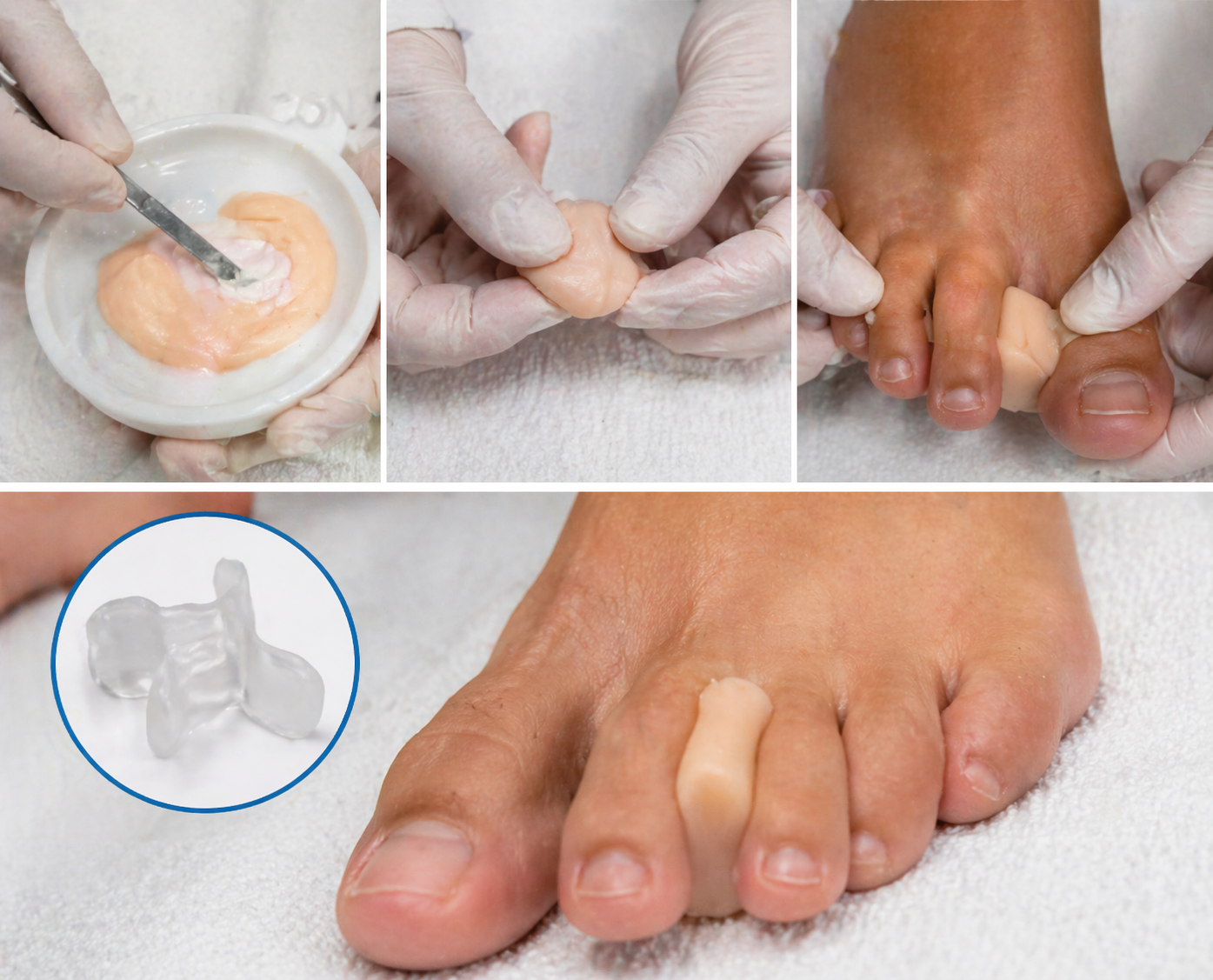 1. Moldable podiatric orthoses are custom-made devices created directly on the patient's foot using two-component silicones (base catalyst). When mixed, a reaction occurs that allows the material to be molded and plasticized in minutes, creating a precise piece to protect, align, or relieve pressure on specific areas.